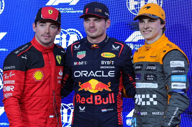 [L-R] Charles Leclerc, Max Verstappen, and Oscar Piastri. (Getty Images)